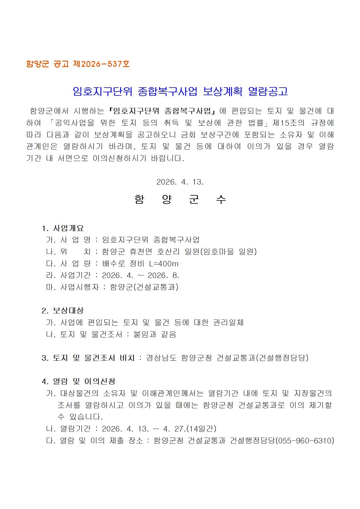 함양군에서 시행하는『임호지구단위 종합복구사업』에 편입되는 토지 및 물건..