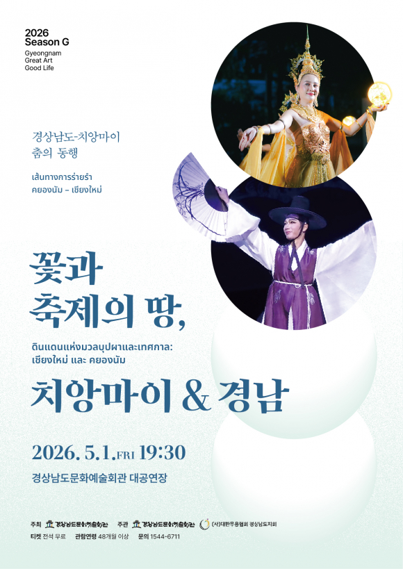 최용석 경남문화예술회관 관장은 “이번 공연은 치앙마이와 경상남도가 문화적 교류를 통해 양 지역 문화의 다양성을 이해하며 예술적 영감을 소중한 시간이 될 것”이라며, “앞으로 경남문화예술회관은 다양한 국제 문화교류를 통해 도민의 문화향유 기회를 넓혀 나가겠다”고 전했다. ▲공연일시 5. 1.(금) 19:30 ▲입장권 전석 무료 (사전 예약) ▲관람연령 48개월 이상 「경상남도-치앙마이 춤의 동행 ‘꽃과 축제의 땅, 치앙마이 & 경남’」공연과 관련된 자세한 사항은 경남문화예술회관 누리집(artcenter.gyeongnam.go.kr) 또는 대표 전화(☎ 1544-6711)로 확인할 수 있다.
